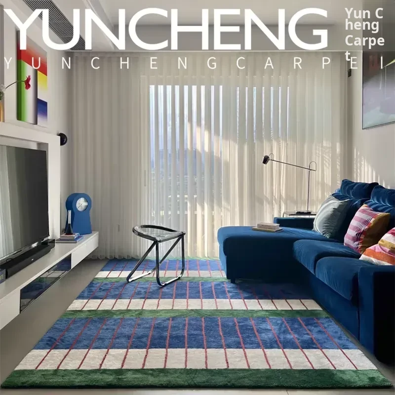 European and American Mediterranean Blue Striped Living Room Area Rug - Modern Sample Room Handmade Carpet for Bedroom and Bedside