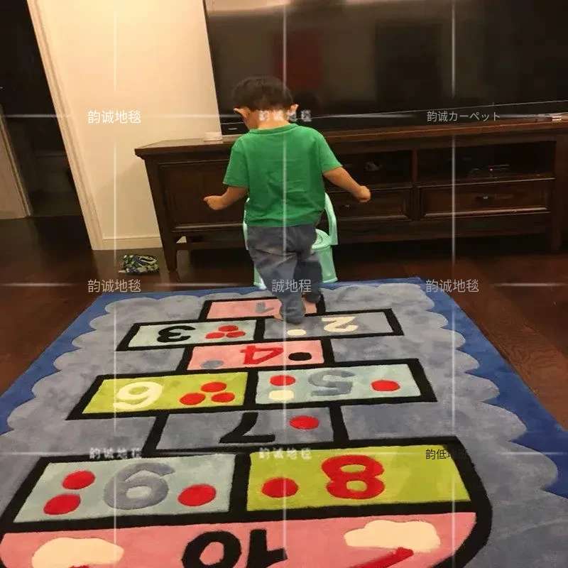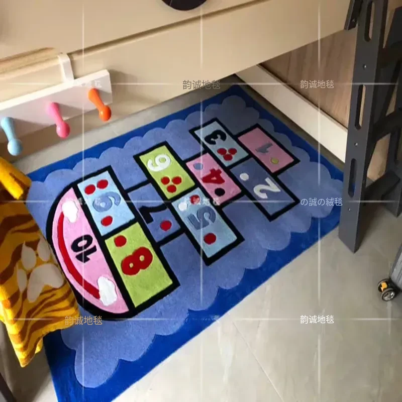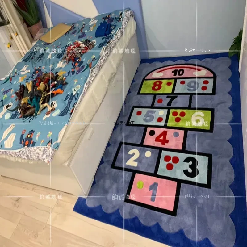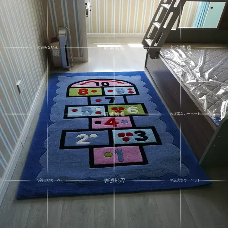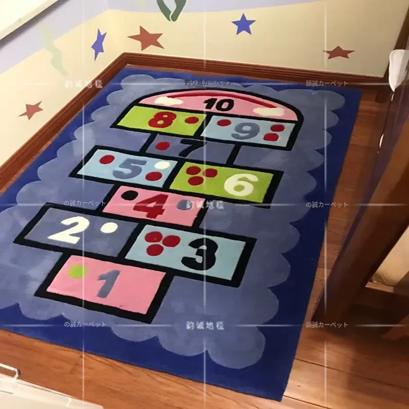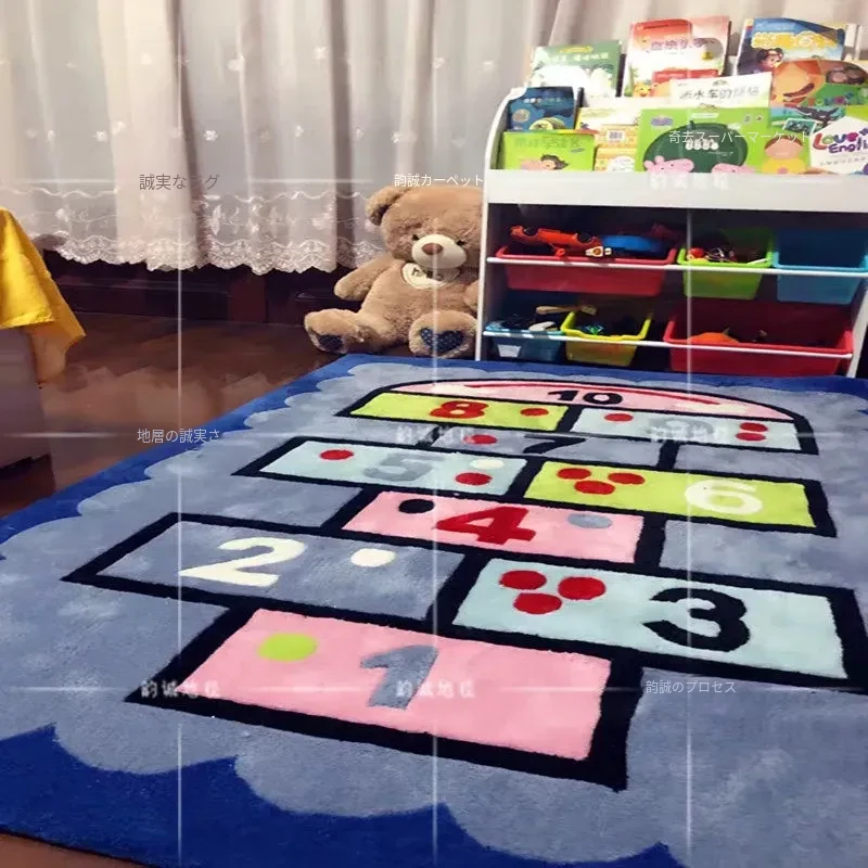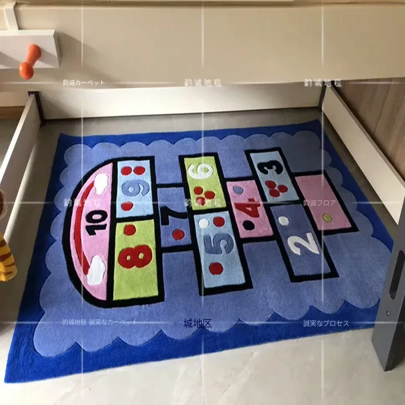 ブルーの男の子・女の子向け楽しい幼稚園カーペット!可愛いキャラクターが描かれた、子供部屋やリビングにぴったりの早期教育用ハンドメイドラグ。お子様の遊び場やお昼寝スペースを明るく彩ります!