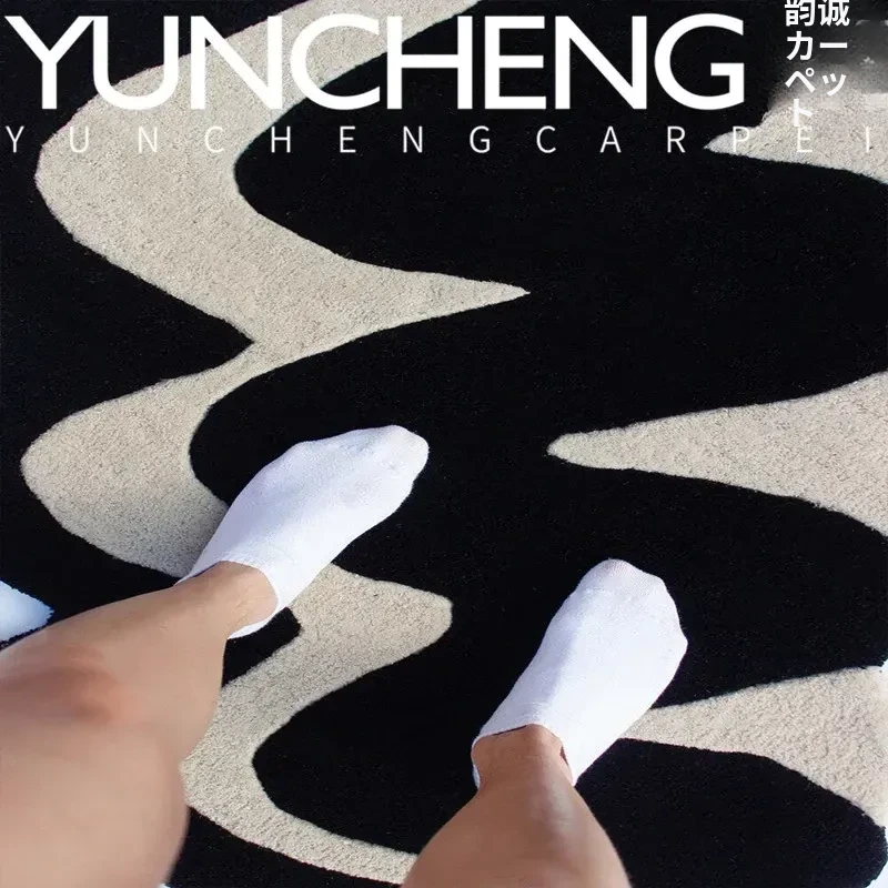 欧米風の軽奢ブラック&ホワイト大波浪デザインのリビングルーム用ラグ。デザイナーが手掛けた寝室や書斎、クローゼット、ベッドサイドにぴったりのスタイリッシュなカーペット。あなたの空間を格上げする一品!