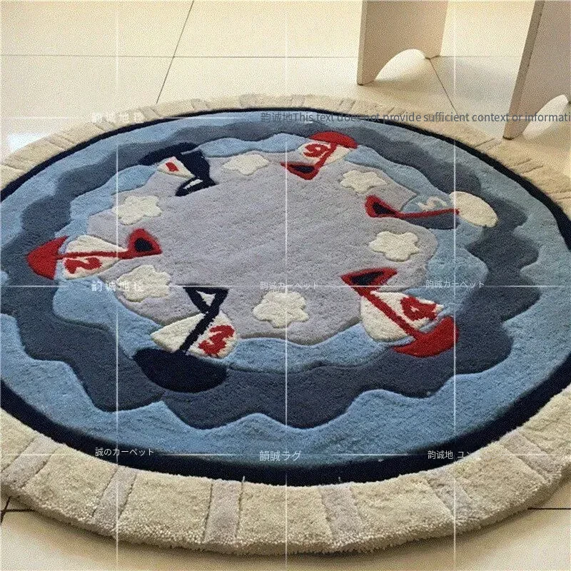 欧風地中海スタイルの帆船デザインラウンドカーペット - 個性的な模様でリビングやベッドサイド、ハンモック、子供部屋に最適!快適さとスタイルを兼ね備えた素敵なインテリアアイテムです。
