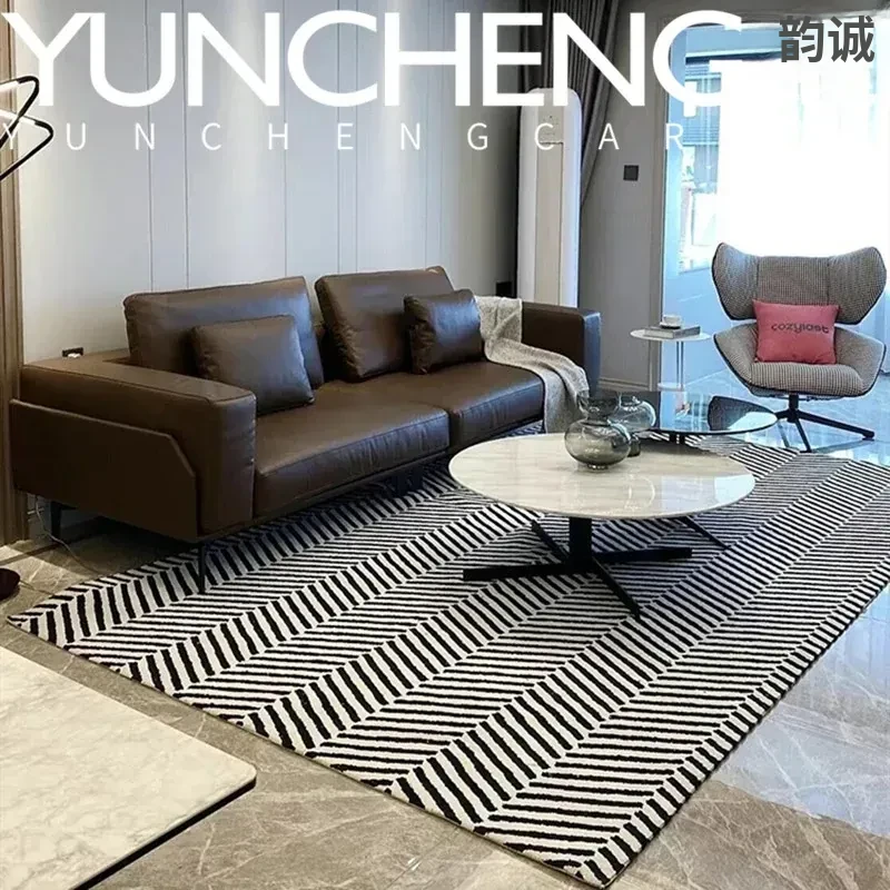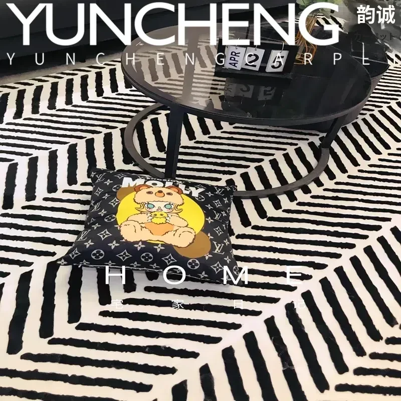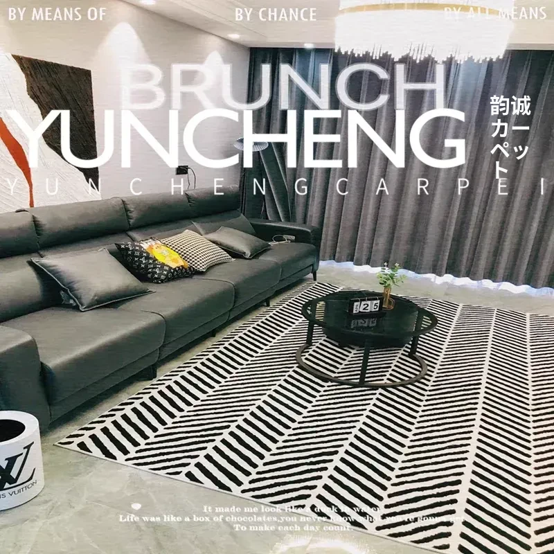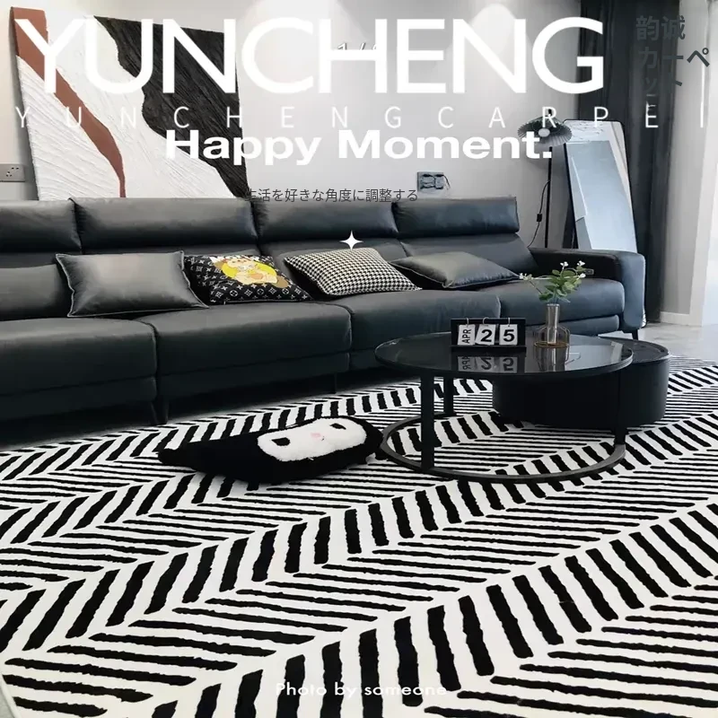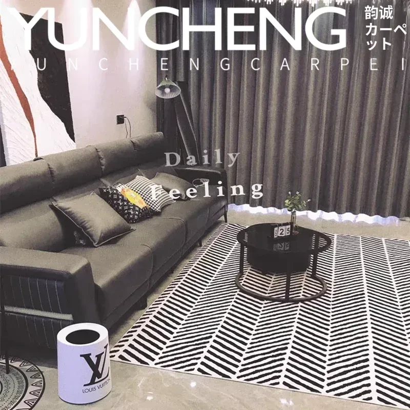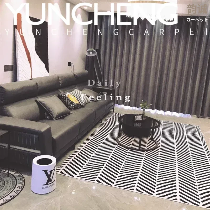 シンプルでラグジュアリーなブラック&ホワイトストライプデザインの欧米スタイルのリビング用コーヒーテーブルカーペット。イタリアンスタイルの寝室や書斎、ベッドサイドにぴったりのフルカバーラグで、お部屋をおしゃれに演出します。