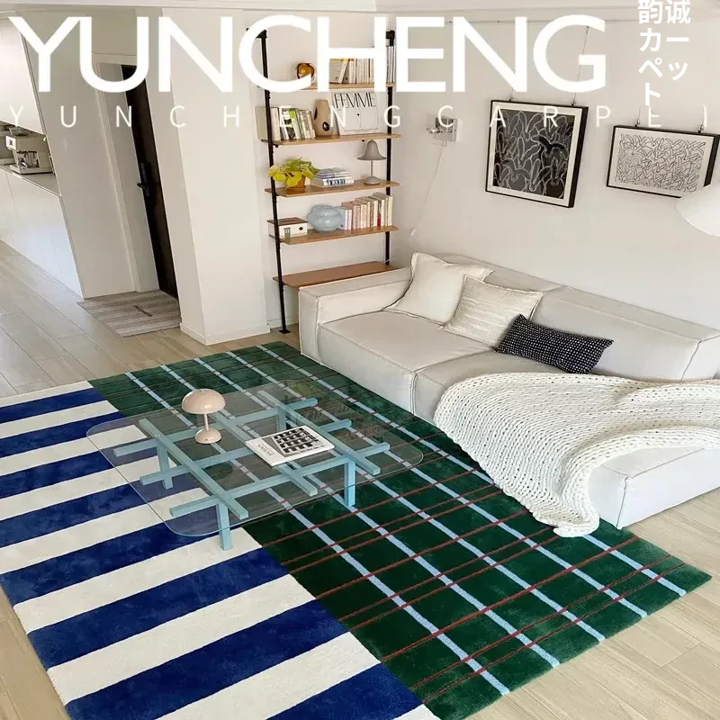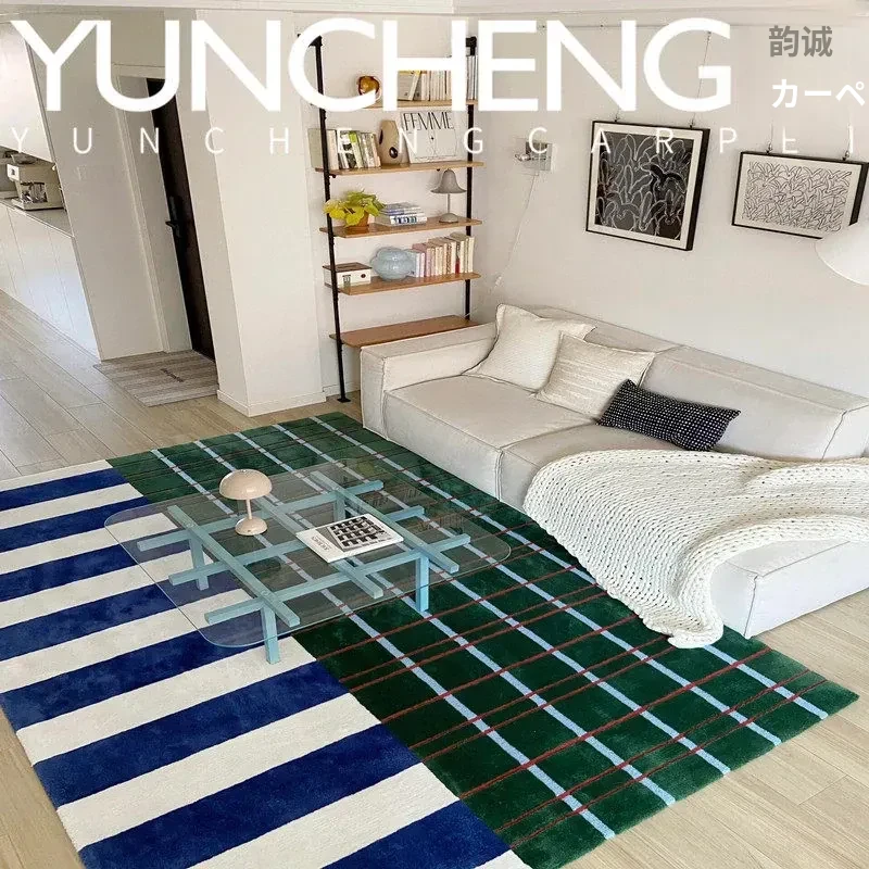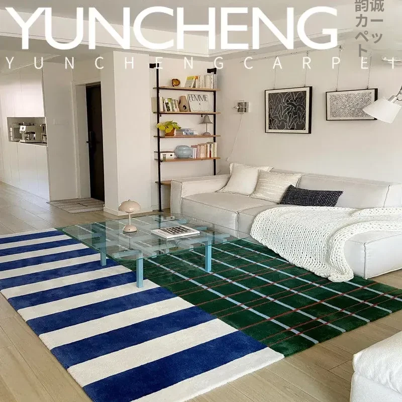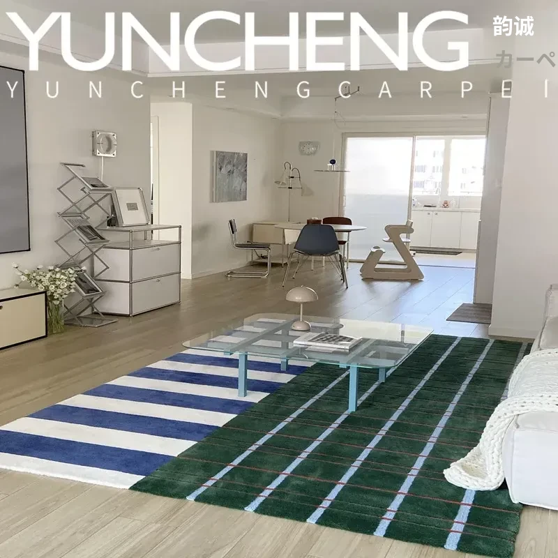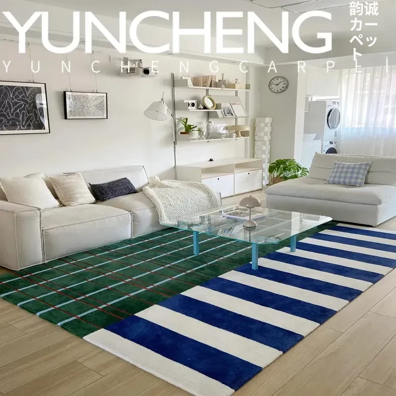 モダンなラグジュアリー感漂うブルードーパミンリビングルーム用コーヒーテーブルカーペット、ヴィンテージストライプデザインの寝室・書斎・クローゼット・ベッドサイドマット。心地よい空間を演出し、洗練された生活を楽しもう!