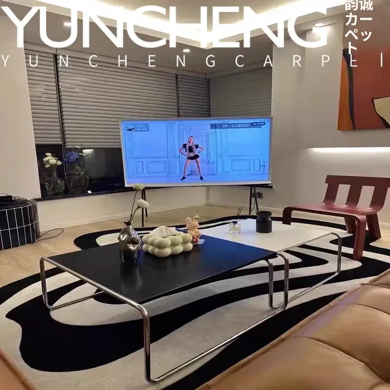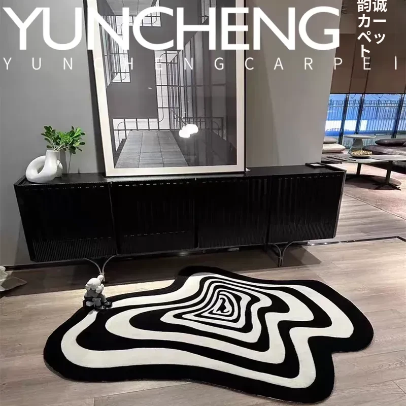 モダン・ミニマリズムの軽やかなラグジュアリー、アートなブラック&ホワイトデザインのリビングコーヒーテーブル用カーペット。北欧スタイルのベッドルーム、書斎、クローゼット、ベッドサイドに最適なラグ。