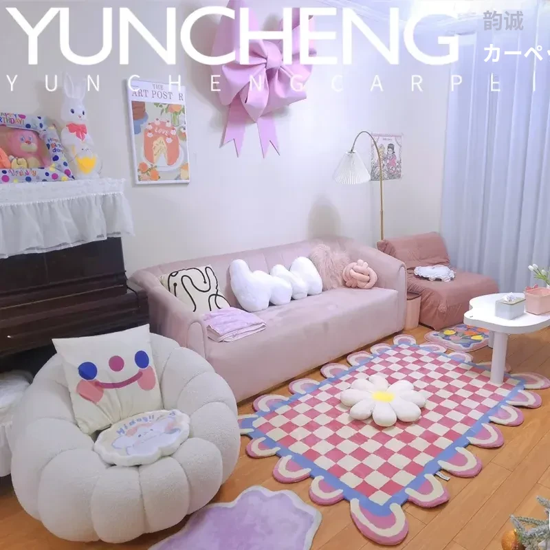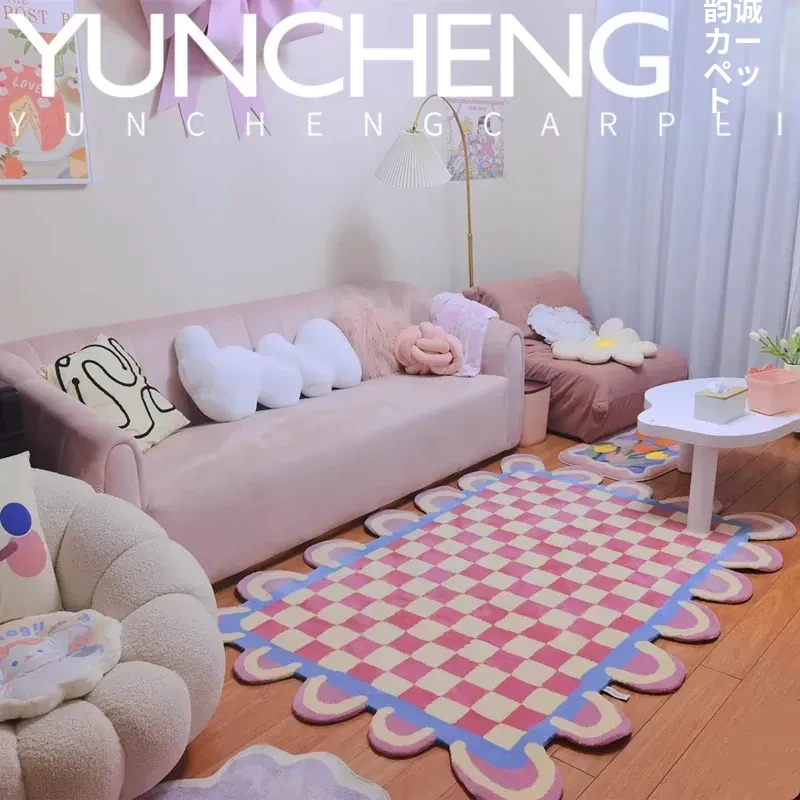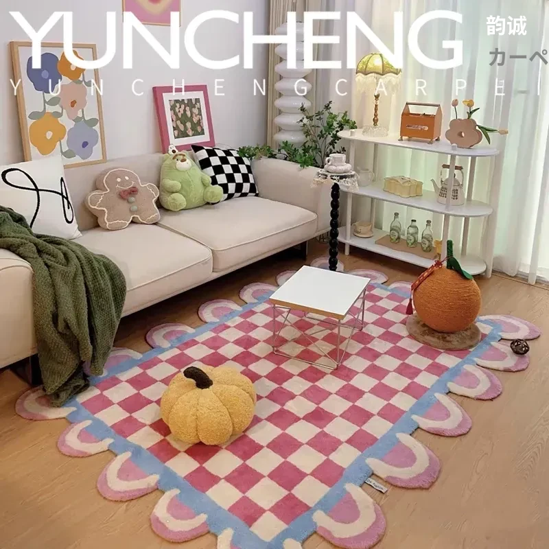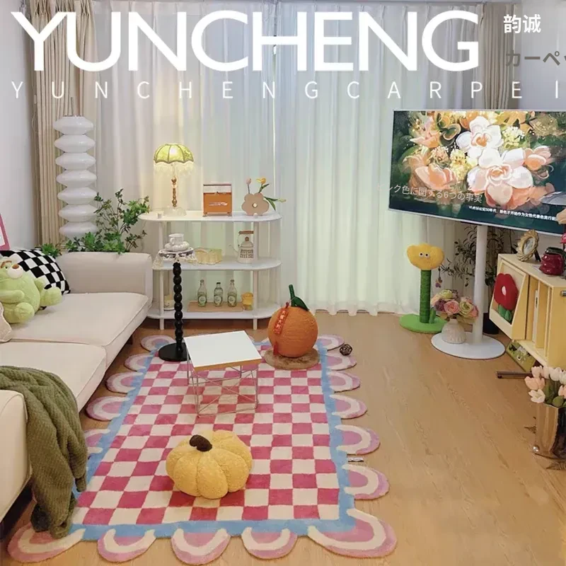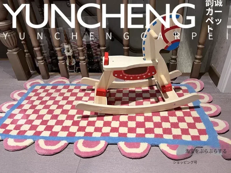 モダンミニマリスト風の可愛いフリル付きピンク&ホワイトチェックのラグ - リビング、寝室、書斎、クローゼット、ベッドサイドに最適!おしゃれで快適な空間を演出します。