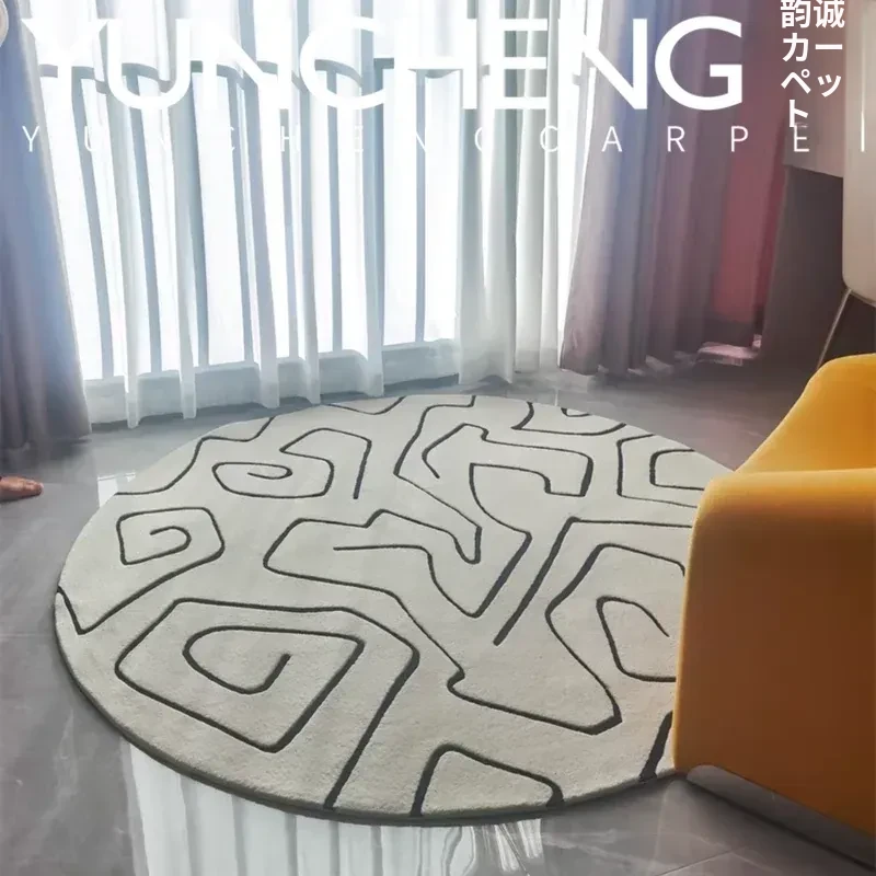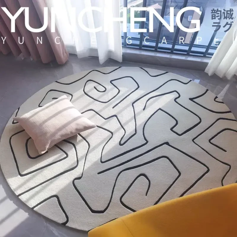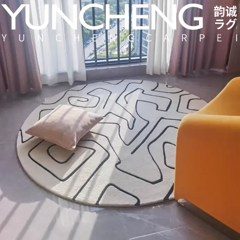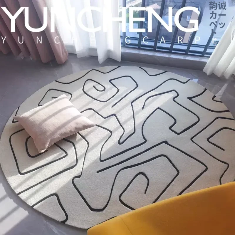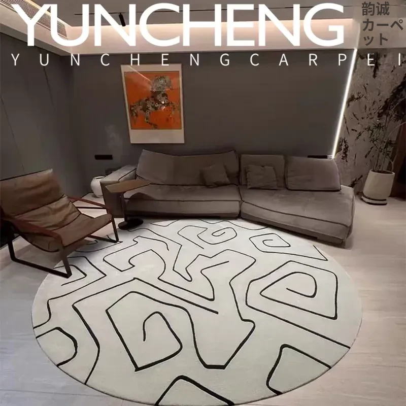 スタイリッシュなミニマリストデザインのベージュラウンドリビングテーブル、ユニークなラインのラグ、寝室・書斎・クローゼット・ベッドサイドマットとしても最適!おしゃれな空間を演出します。
